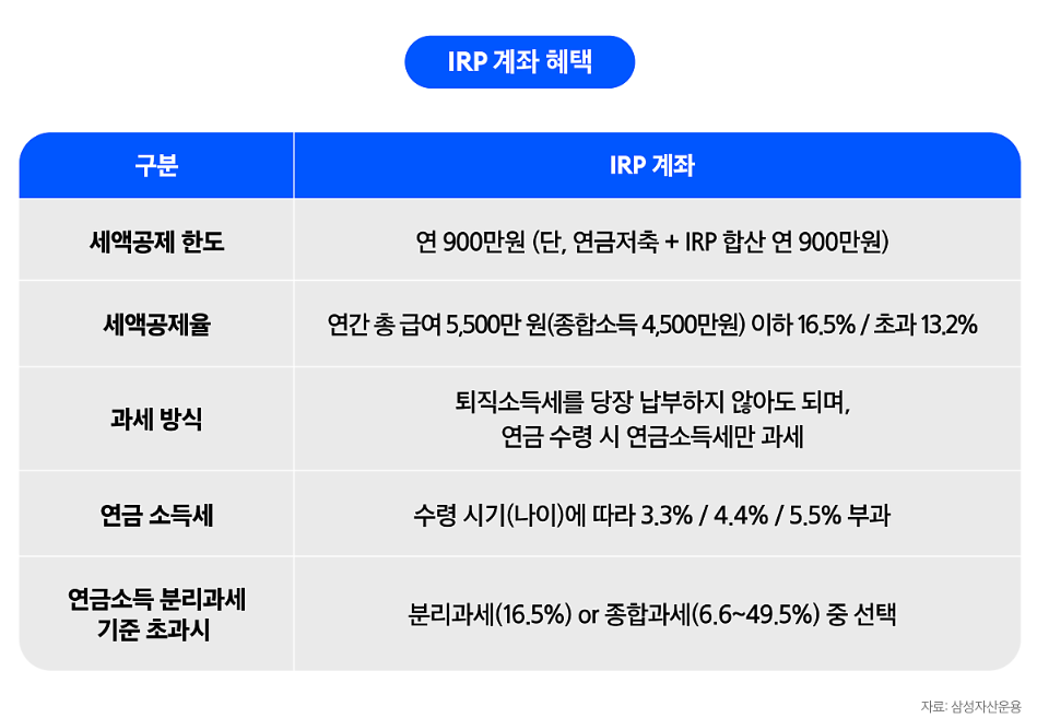 - 퇴직 후 IRP 계좌에 퇴직금을 이월하면, 세금을 미룰 수 있습니다.