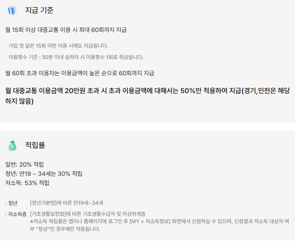 • 교통비 할인: 전국적으로 대중교통 이용 시 혜택을 제공하며, 일부 지역에서는 할인 금액이 다를 수 있습니다.